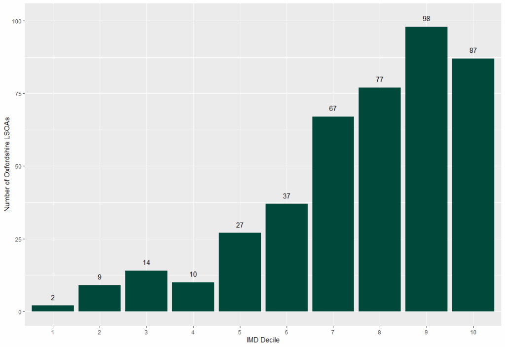Comparatively, there are 185 LSOAs in Oxfordshire ranked in the two least deprived deciles. This is over 40% of LSOAs in the county.