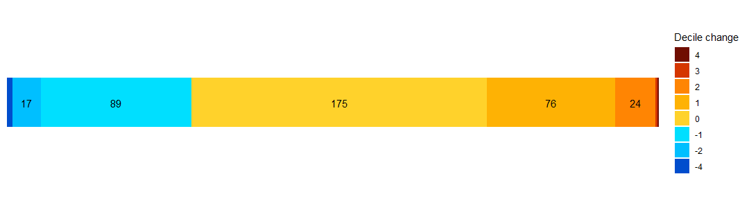In 2025, 102 LSOAs decreased their IMD decile (meaning that their level of deprivation increased as 1 is the most deprived) and 109 increased their decile.